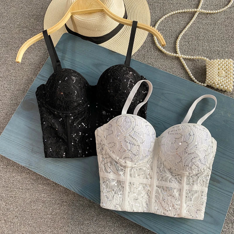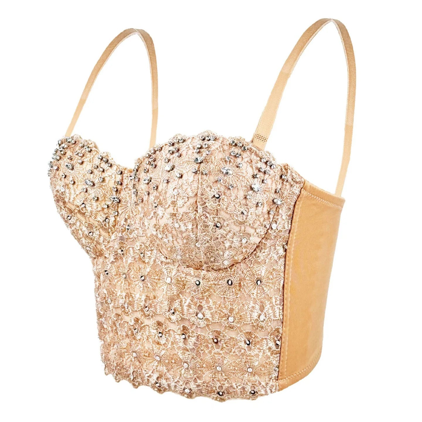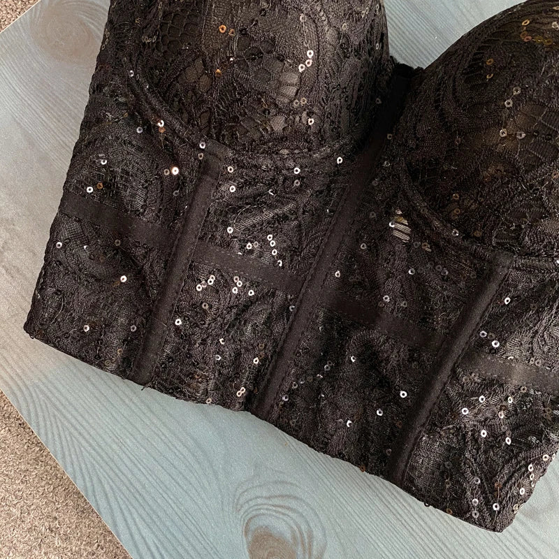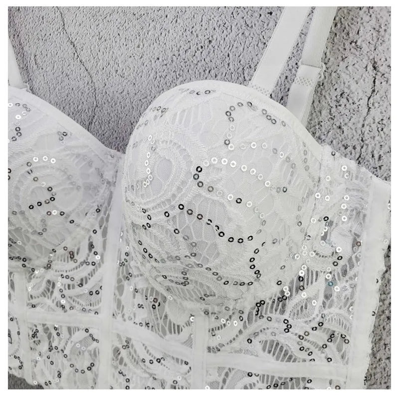 Turn heads with this shiny sequined lace bustier, featuring floral beading and a stylish cropped design perfect for clubbing and parties.