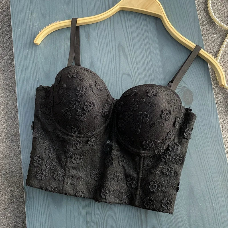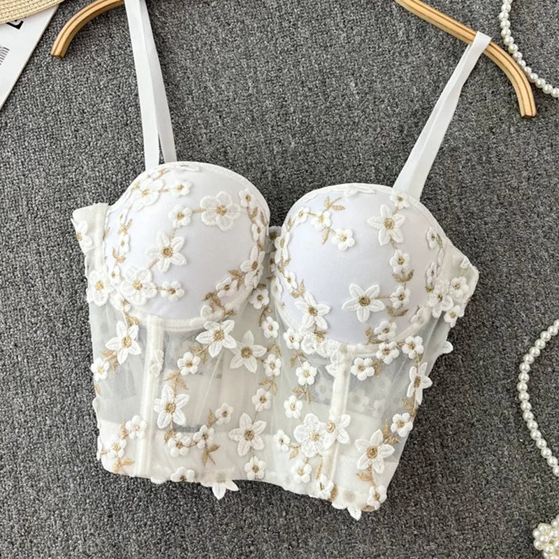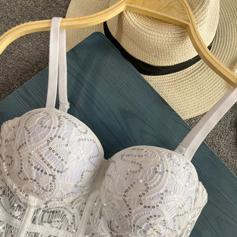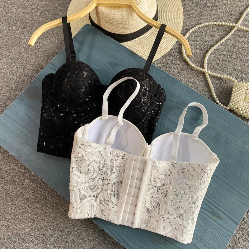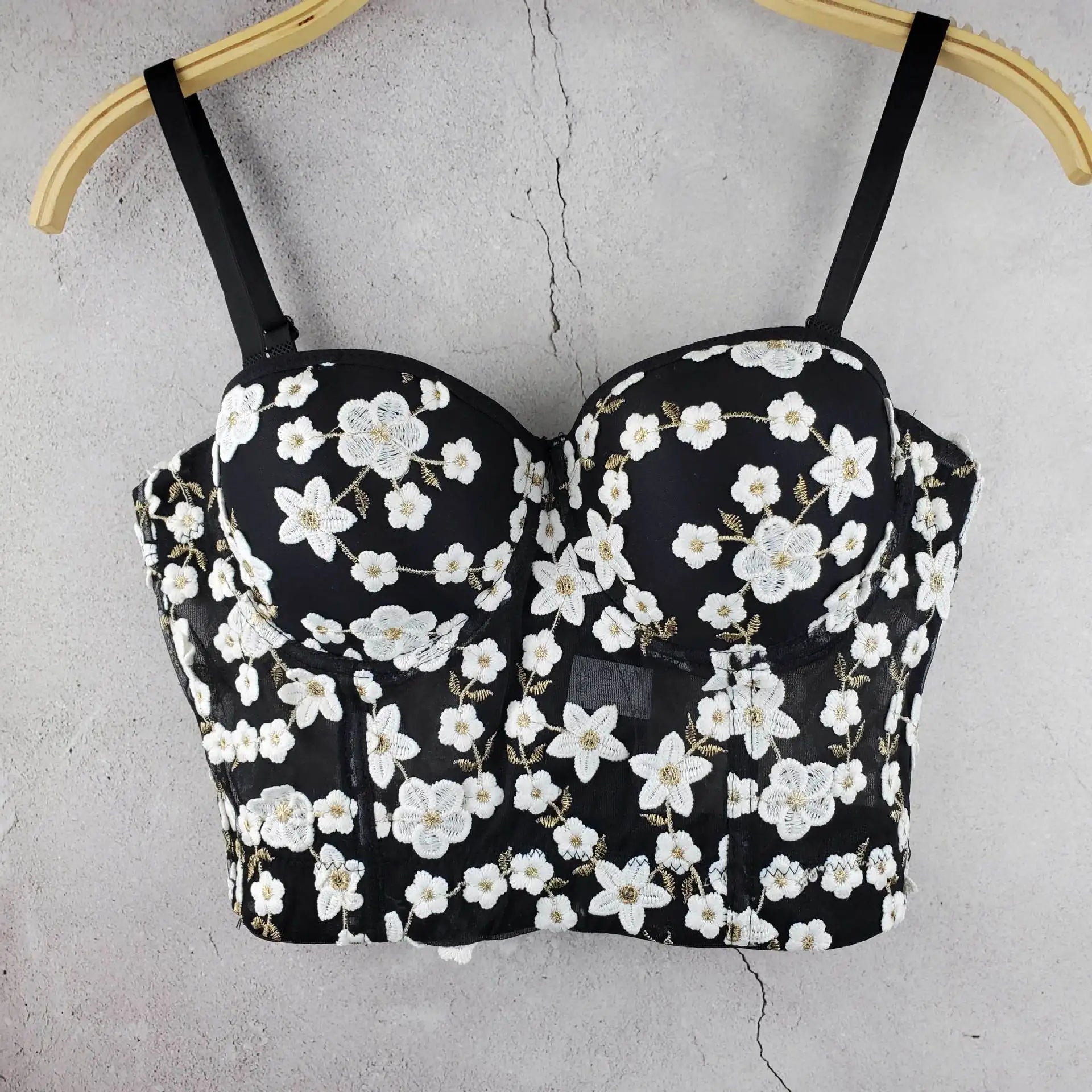 Turn heads with this shiny sequined lace bustier, featuring floral beading and a stylish cropped design perfect for clubbing and parties.